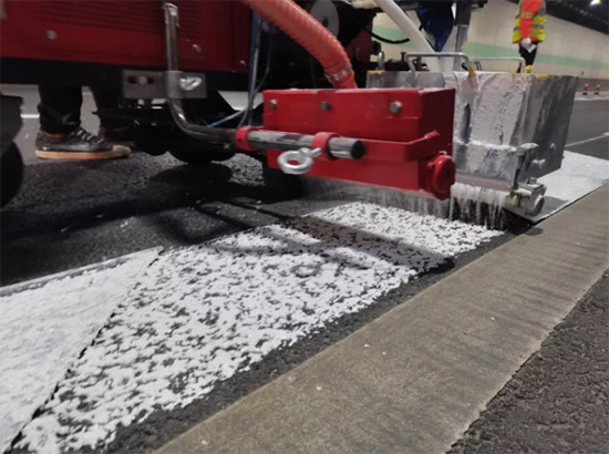 双组份标线是一种环境友好型标线,其具有其它类型标线难于比拟的反光性、耐侯性及耐磨性,且整个生命周期内几乎无粉尘磨耗,有效解决了传统溶剂型标线施工时有溶剂挥发、使用过程不耐磨及反光效果差,以及热熔型标线施工时耗费燃料、使用过程磨耗大量粉尘漂浮空气中等弊端。